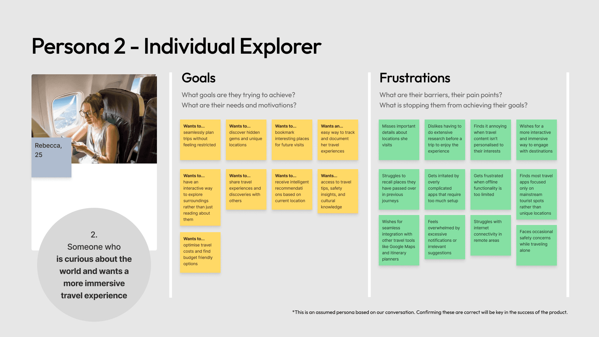 The second was that travel experiences often feel generic. People have different interests, different reasons for travelling, and different levels of engagement, but existing in-flight experiences rarely adapt to that. There was also no meaningful way to save places, build on discoveries later, or turn travel inspiration into future action.